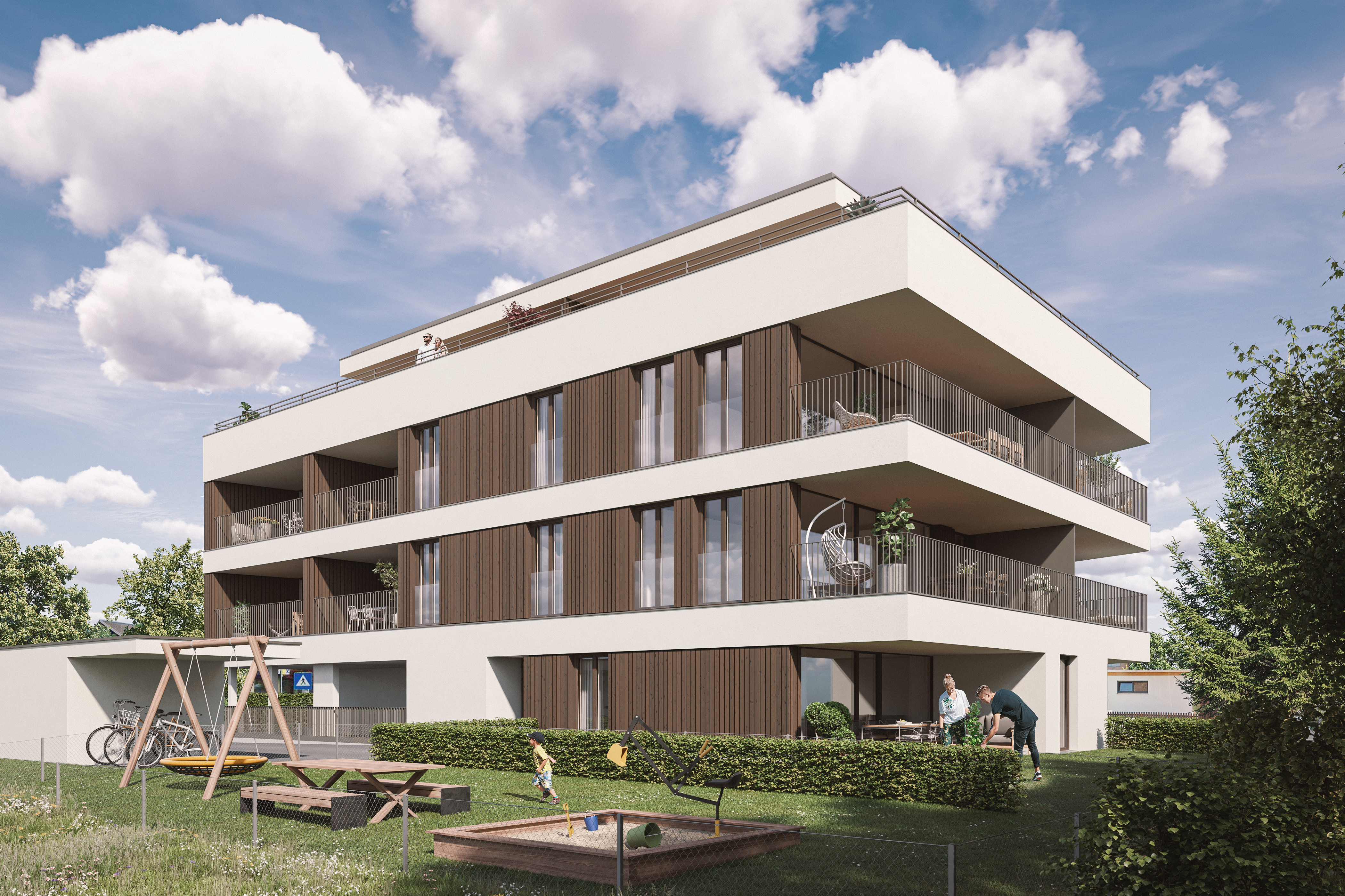 Das Gebäude besticht durch klare, elegante Architektur mit vertikal angeordnetem Verputz, Holz und raumhohen Fenstern. Die Wohnanlage mit 14 Einheiten fügt sich harmonisch in die Umgebung ein und ist über ein zentrales, barrierefreies Treppenhaus mit Lift erreichbar. Im Erdgeschoss befinden sich drei Wohnungen und ein Büro, jeweils mit Gartenanteil. Die Obergeschosse bieten Loggien oder Terrassen. Alle Wohnbereiche sind mit Eichenparkett ausgestattet und verfügen über elektrische Jalousien oder Senkrechtmarkisen. Fußbodenheizung sorgt für angenehme Wärme. Im Untergeschoss gibt es Kellerabteile, einen Fahrradraum und eine Tiefgarage mit 13 Stellplätzen für Elektromobilität. Das Heizsystem kombiniert eine Wärmepumpe mit Erdsonde und eine Photovoltaikanlage. Hochwertige Wärmedämmung und 3-fach verglaste Holzfenster gewährleisten Energieeffizienz.