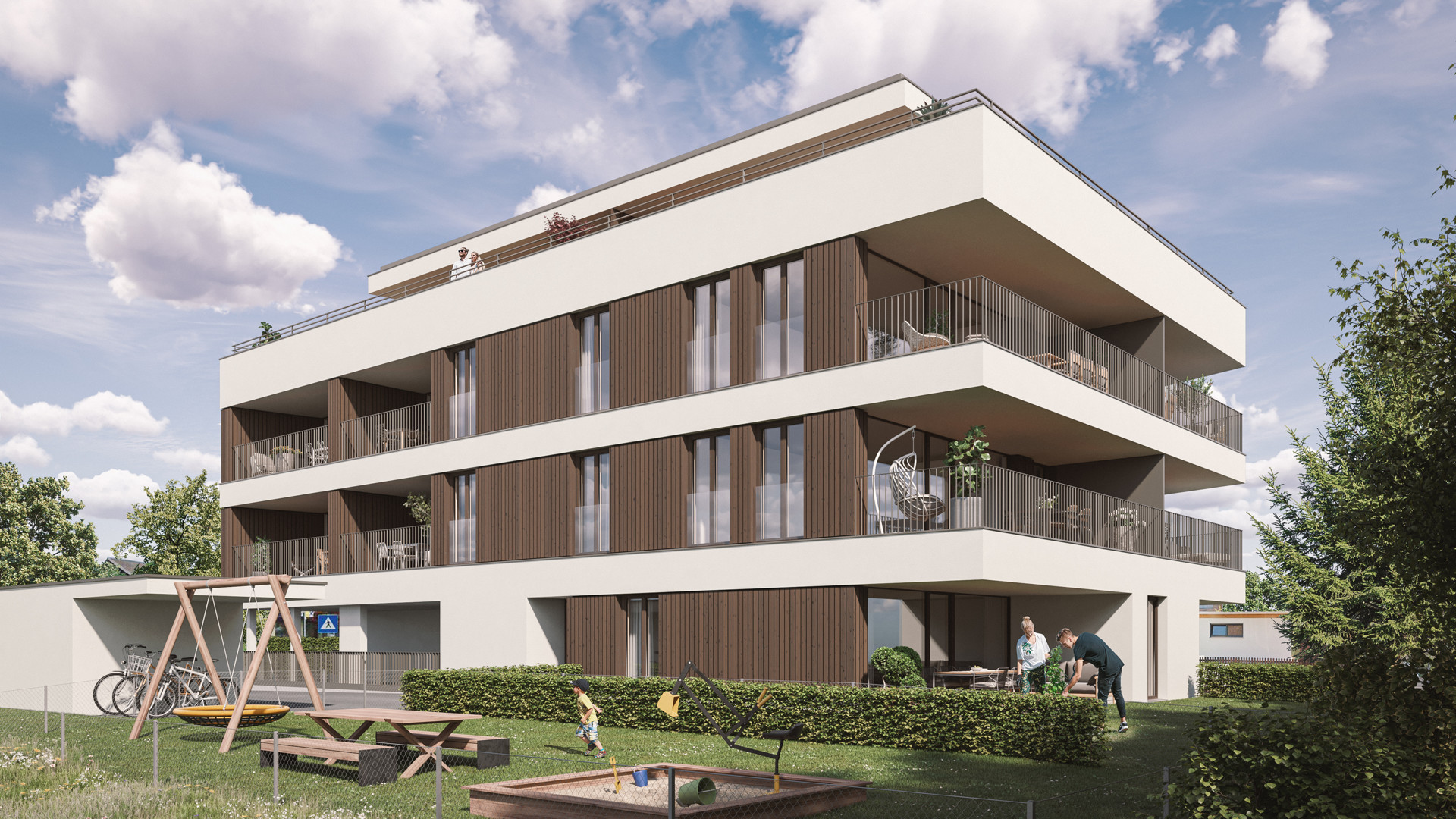 Hoch über dem Rheintal liegt unsere neue Wohnanlage in Viktorsberg. Die durchgängigen Holzfensterfronten mit einer Fassade aus naturbelassenen Fichtenschindeln und einem Ziegeldach schaffen ein modernes und smartes Äußeres, das sich stimmig in die ländliche Umgebung integriert. Die Hanglage des Gebäudes setzt gleich zwei Highlights: Zum einen lässt der unvergleichliche Ausblick übers vordere Rheintal und die Appenzeller Alpen keine Wünsche mehr offen. Zum anderen bewirkt der rückseitige Hang quasi eine natürliche Isolierung und hilft somit, Energie zu sparen. In Verbindung mit einem Pellets-Heizsystem und einer Photovoltaik-Anlage nach modernstem Stand, ist nachhaltiges Wohnen garantiert.